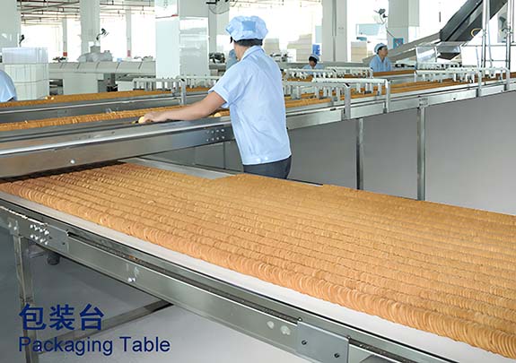 Large biscuit line:1.Flour mixer---2.Dough cutting machine ---3.Dough conveyor---4.Hard forming machine---5.soft biscuit forming machine---6.Inlet oven conveyor---7.Intelligent Temperature Control Tunnel Oven---8.Outlet oven conveyo-r--9.Oil spray---10.Cooling section line---11.180°turning machine---12.Cooling line---13.Biscuit stacking machine---14.Stacking table