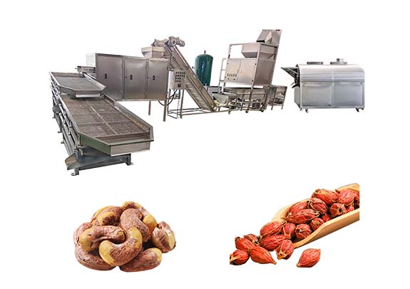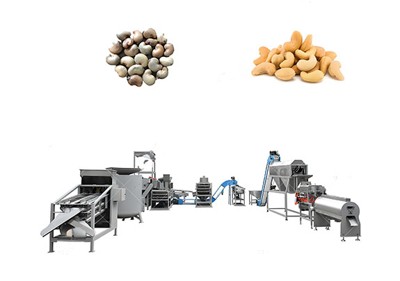 The cashew processing line is mainly consists of raw material grading equipment, raw material cooking equipment, cashew nut shelling unit, drying equipment, humidification mechanism, loosening and peeling unit, finished product grading equipment, color sorting unit (optional), and packaging equipment.