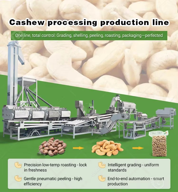 A fully automated industrial solution for efficient shelling, peeling, and grading of cashew nuts, ensuring high-quality output with minimal labor.