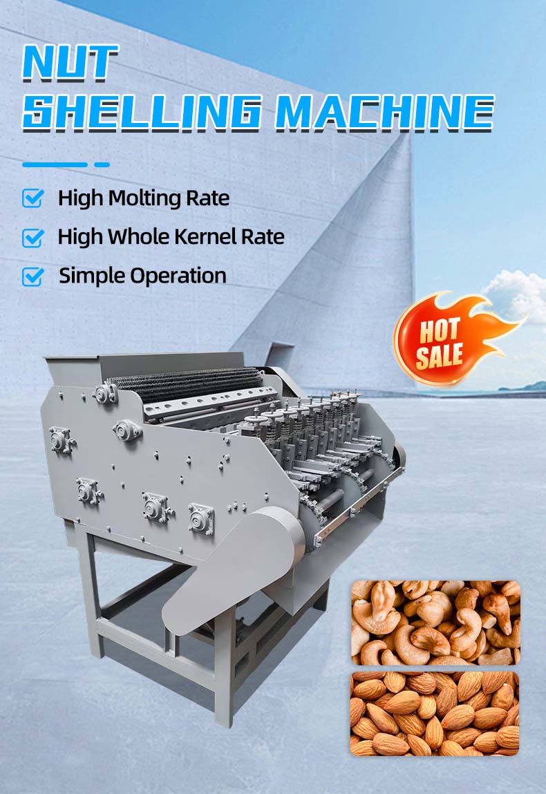 This automated nut shelling machine efficiently processes cashews, almonds, walnuts, hazelnuts, pecans, and pine nuts with 98% kernel integrity. Featuring adaptive shelling technology and PLC controls, it handles 500kg/h and integrates seamlessly with roasting/sorting/packaging lines for snack, baking, and food processing industries.