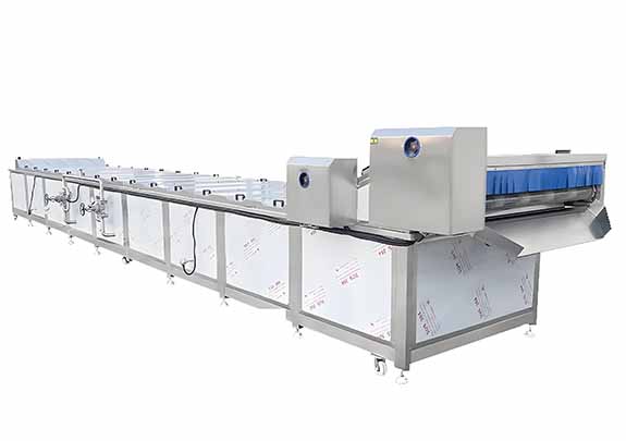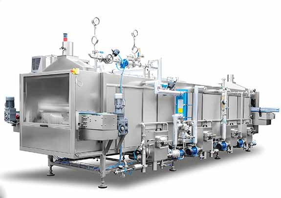A conveyor-based system spraying products with temperature-controlled water in multiple zones for bottled/canned food sterilization.