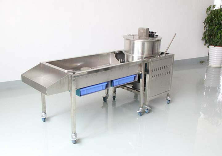 This industrial popcorn processing machine has a very compact structure, which includes the heating system, mixing and baking barrel, electric controller, cooling tank, and so on. The heating method can be of two kinds: electromagnetic heating and liquefied gas heating. The mixing and baking barrel can be flexibly reversed. When the popcorn is made, pull down the baffle, and the mixing drum will automatically flip and pour the popcorn into the cooling tank. The cooling tank has a layer of the deoiling screen so that the final popcorn can be removed from excess oil and be cooled quickly. The countertop and scoop for processing popcorn are all made of stainless steel.